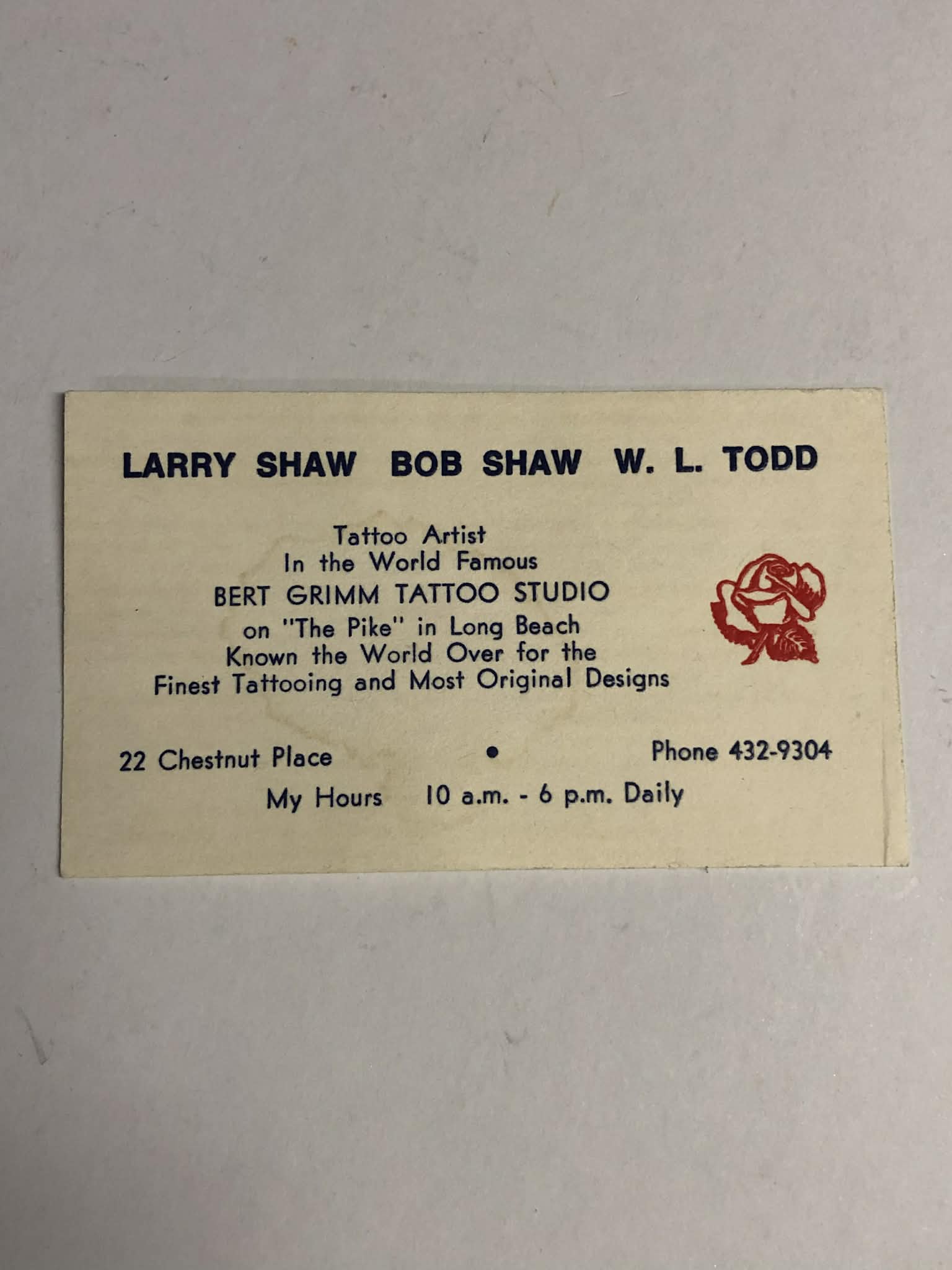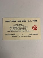 1072 Bob Shaw Colonel Todd and Larry Shaw business card from Bert Grimm Tattoo Studio