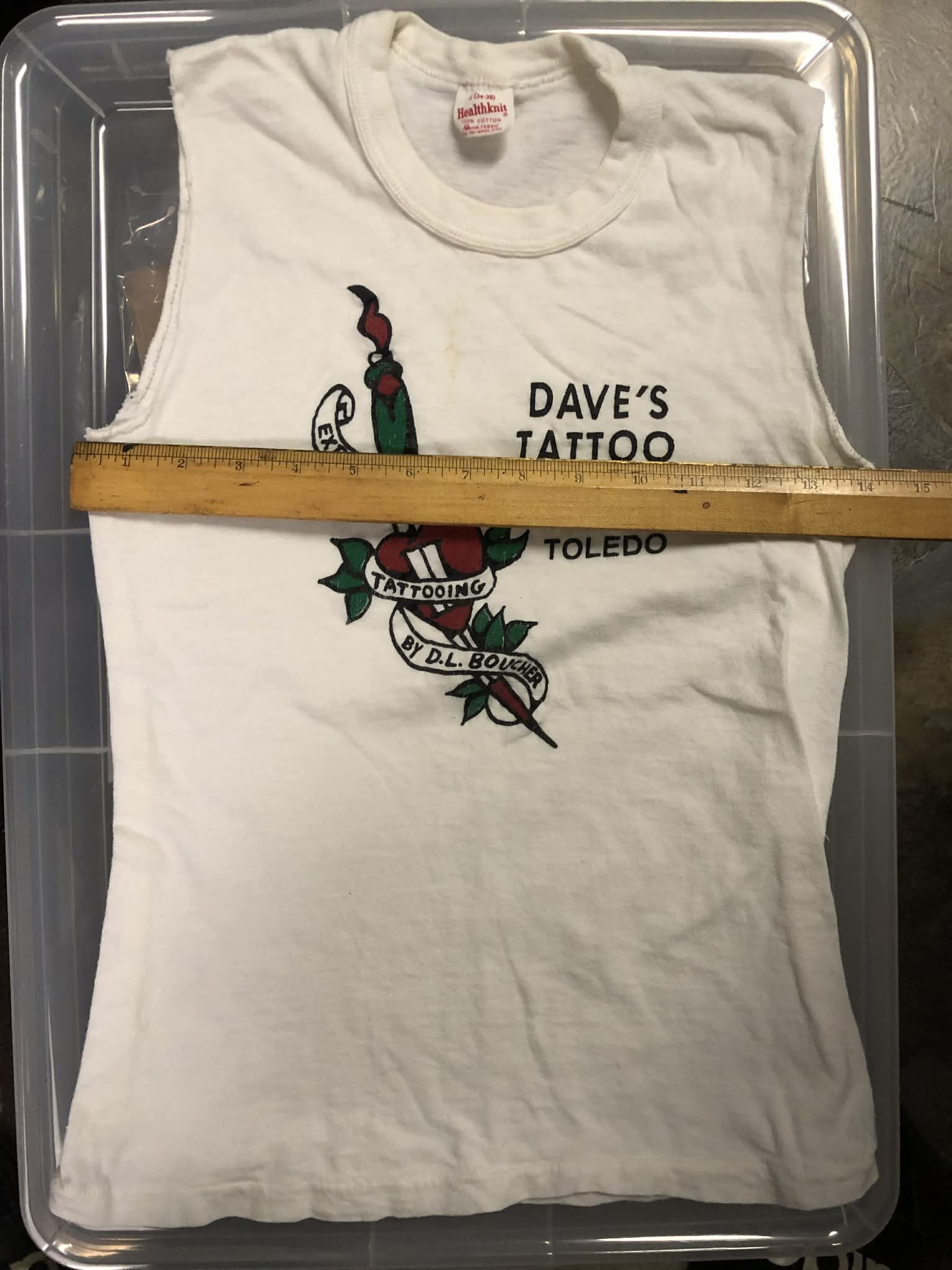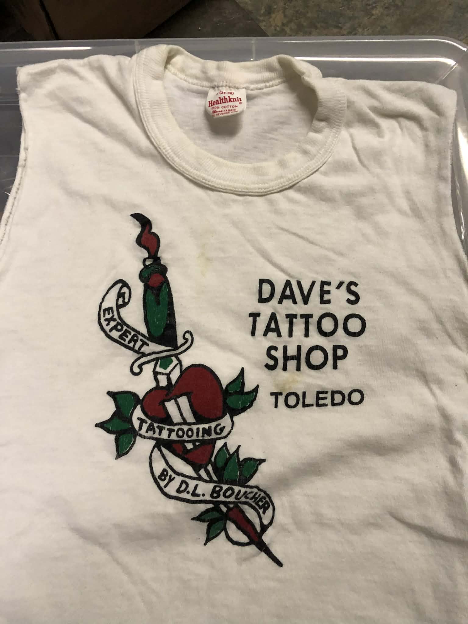 Dave apprenticed under Stoney. This shirt is likely unwearable, the graphics feel stiff, the fabric feels ok but the tank is very small. But it’s the oldest tattoo shirt I’ve come across. Display piece.