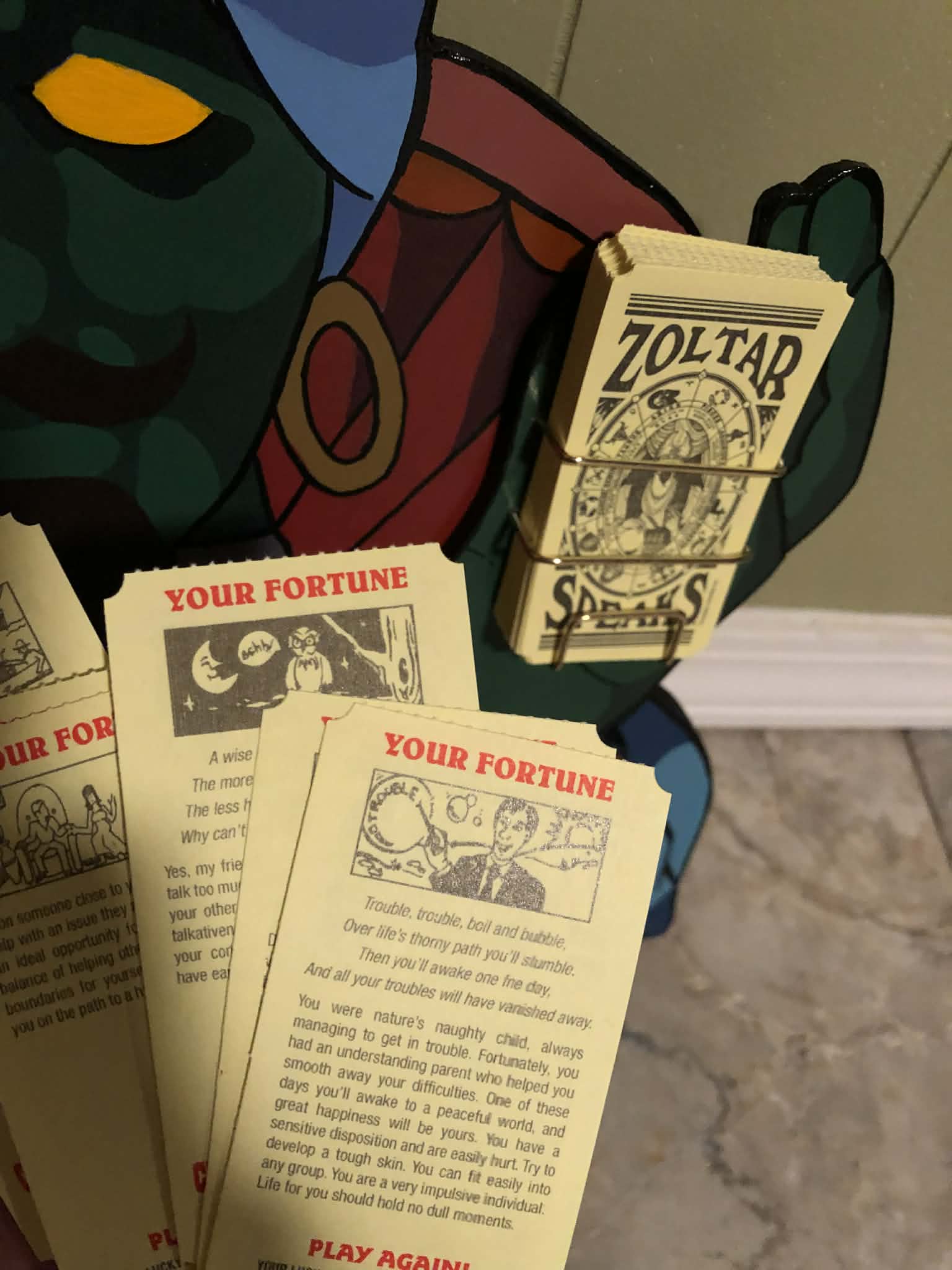 Includes authentic Zoltar fortune cards with different fortunes. Roughly 16x19