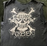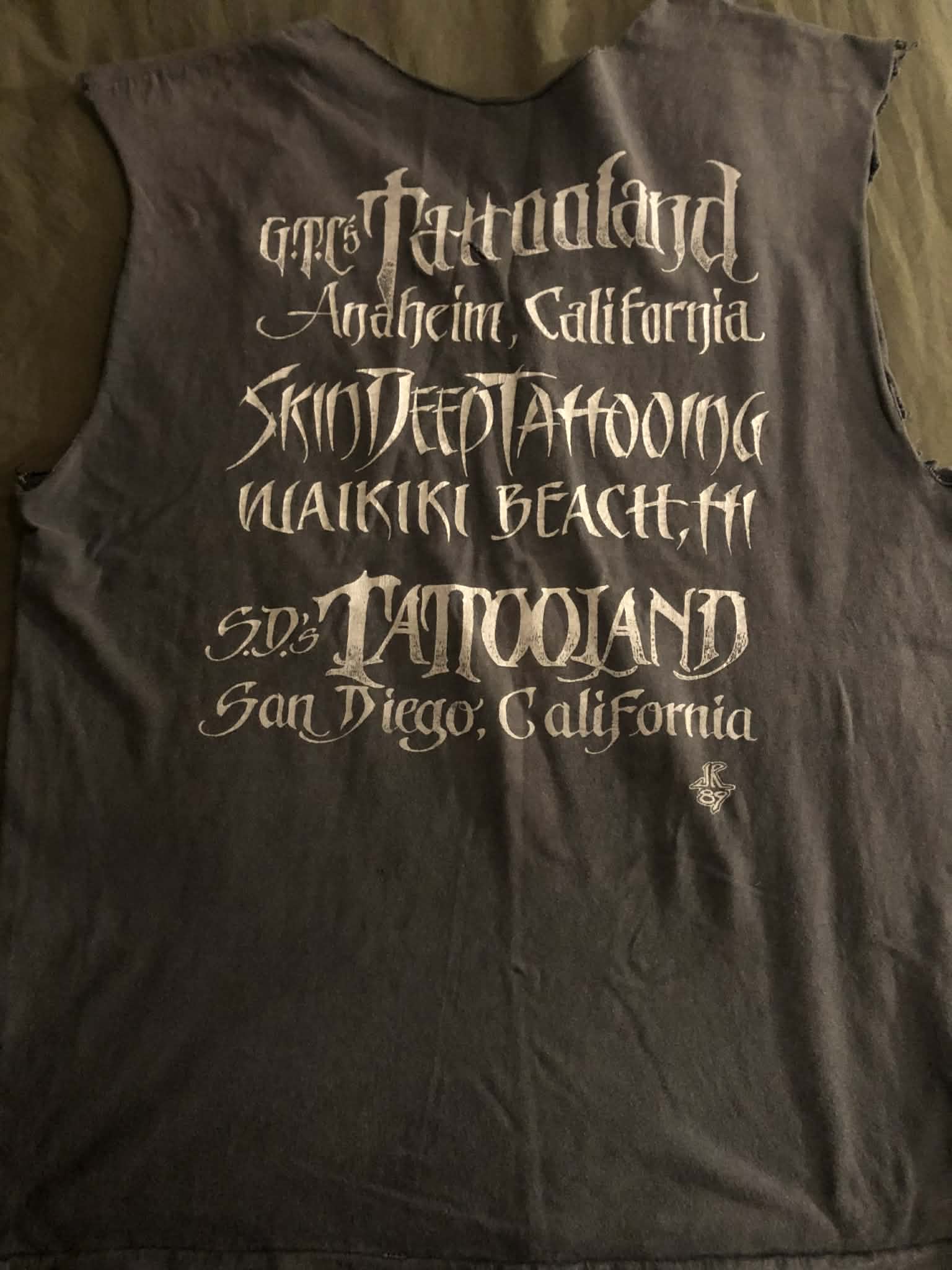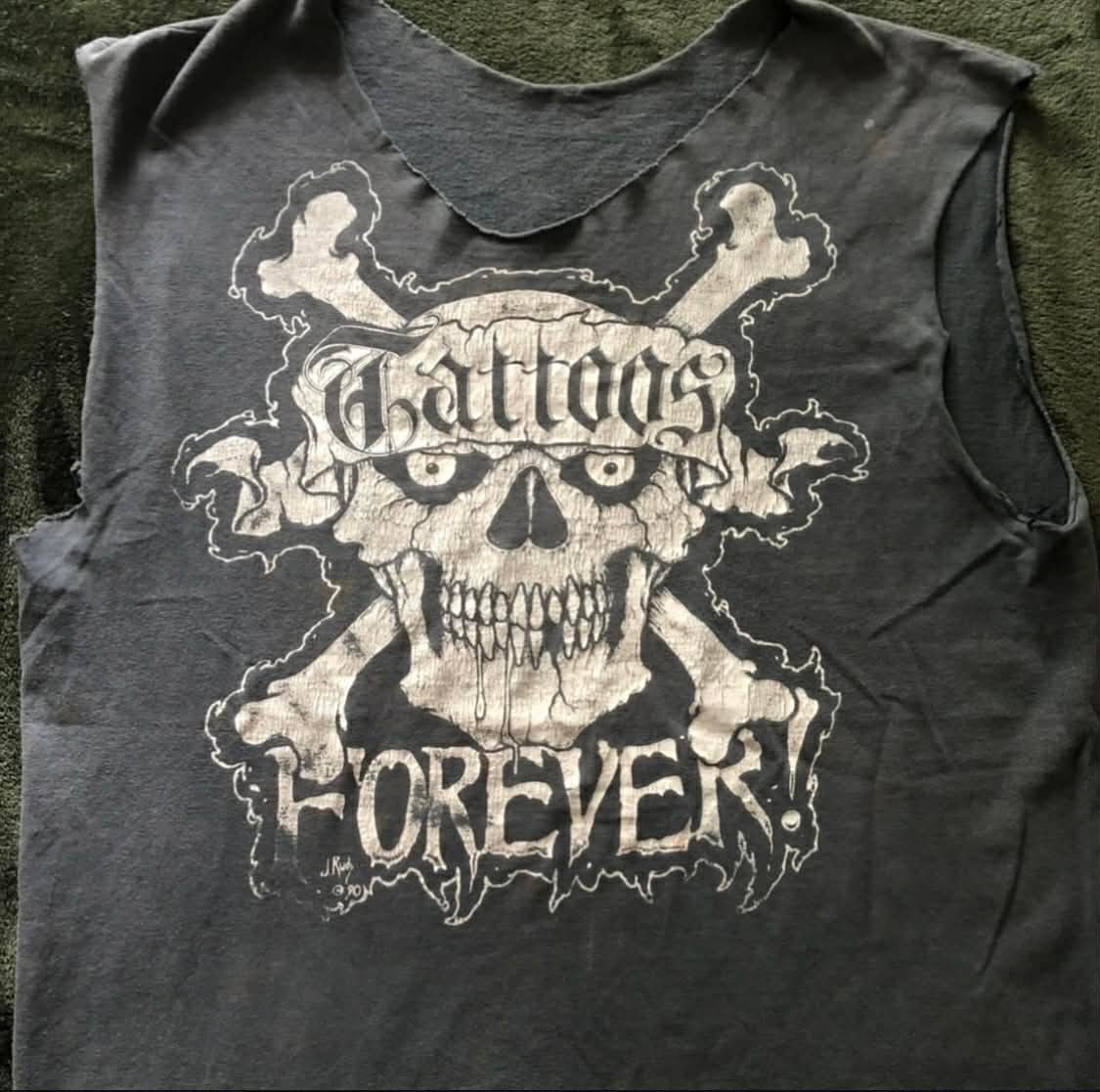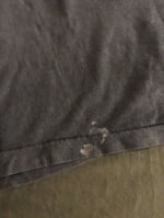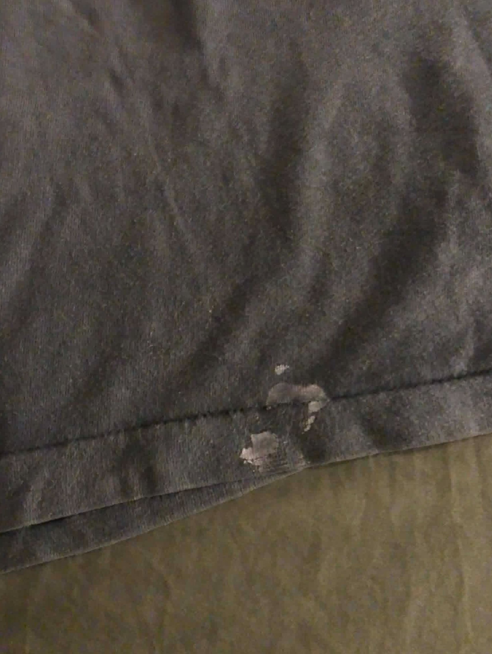 Fits like a baggy medium in my opinion. Arms and neck cut, a couple small white paint spots but overall thick and no rot