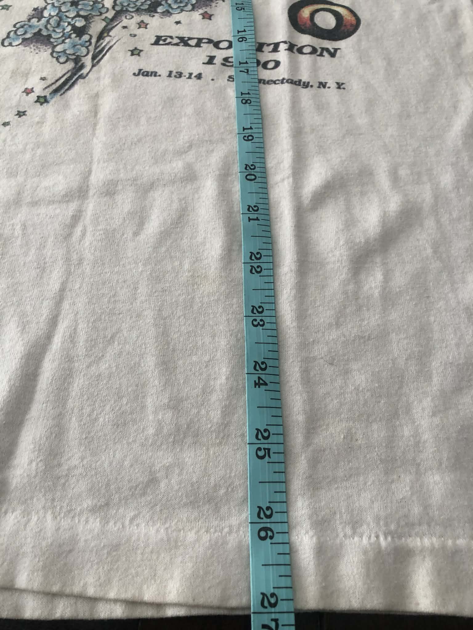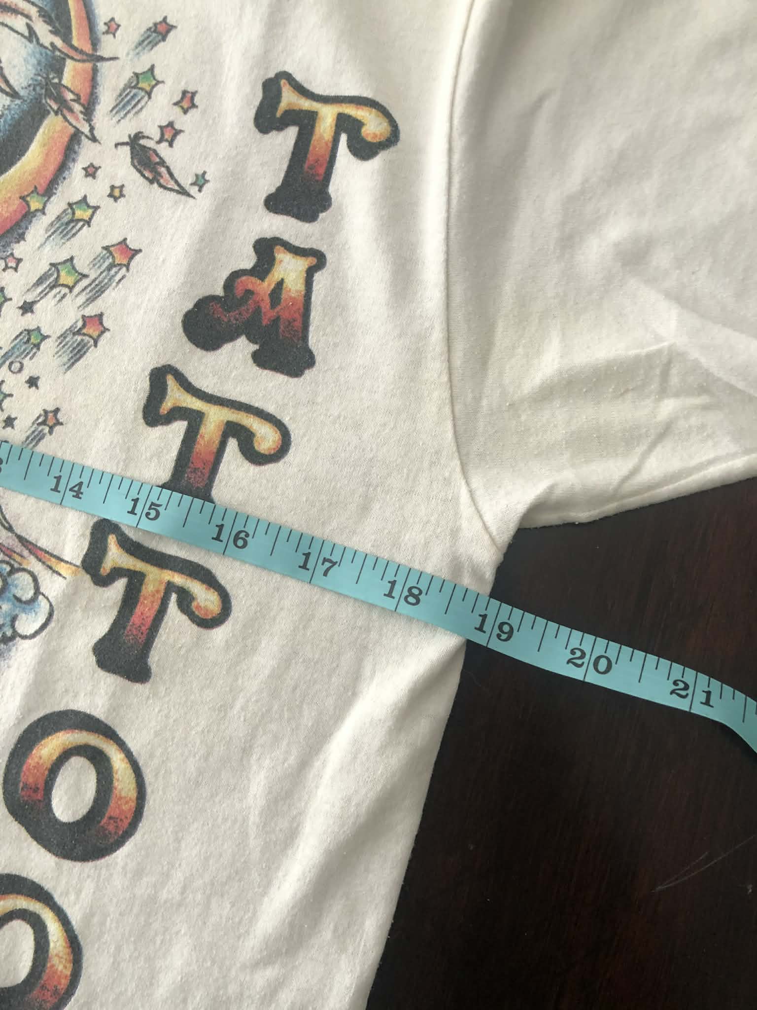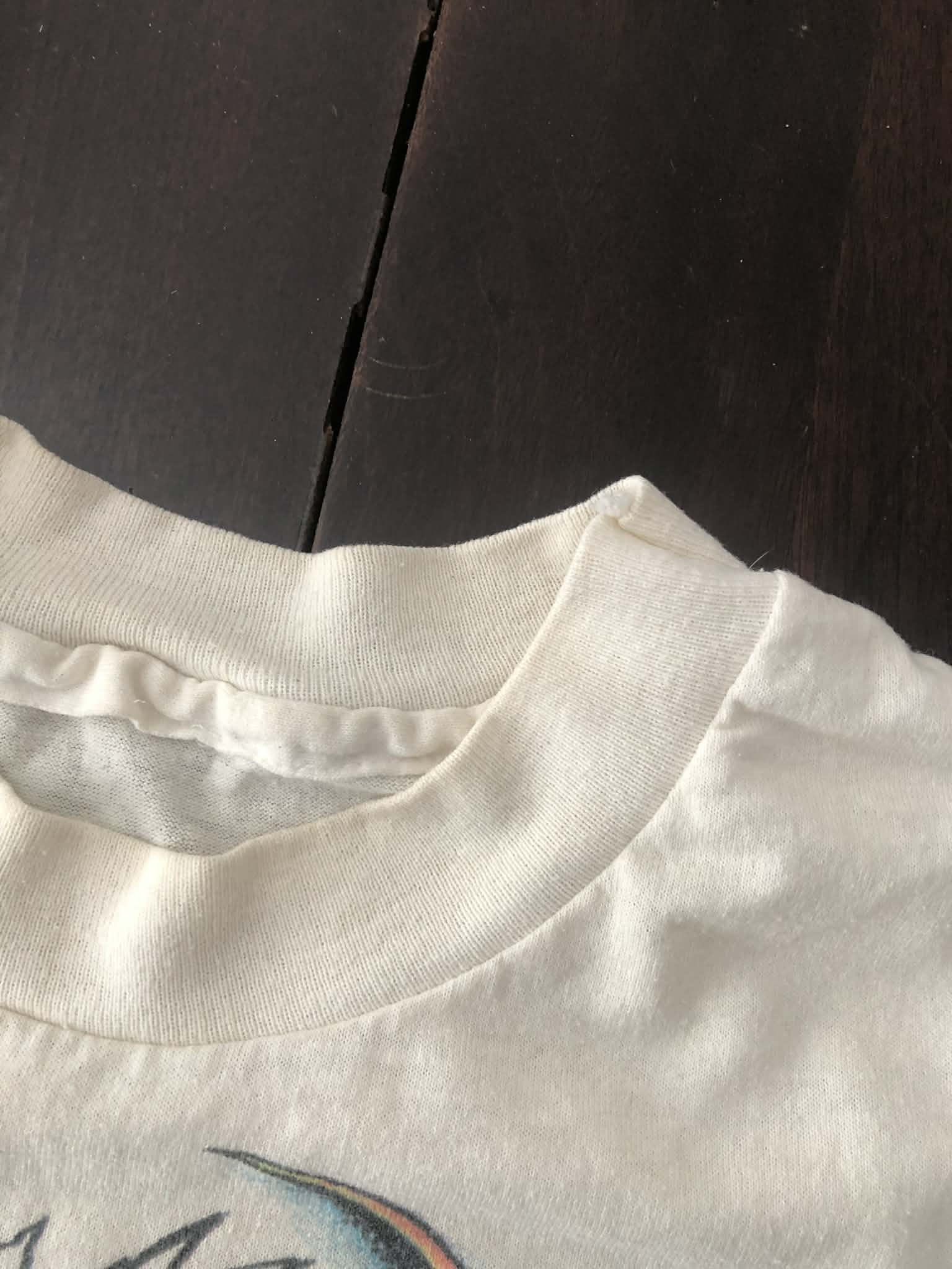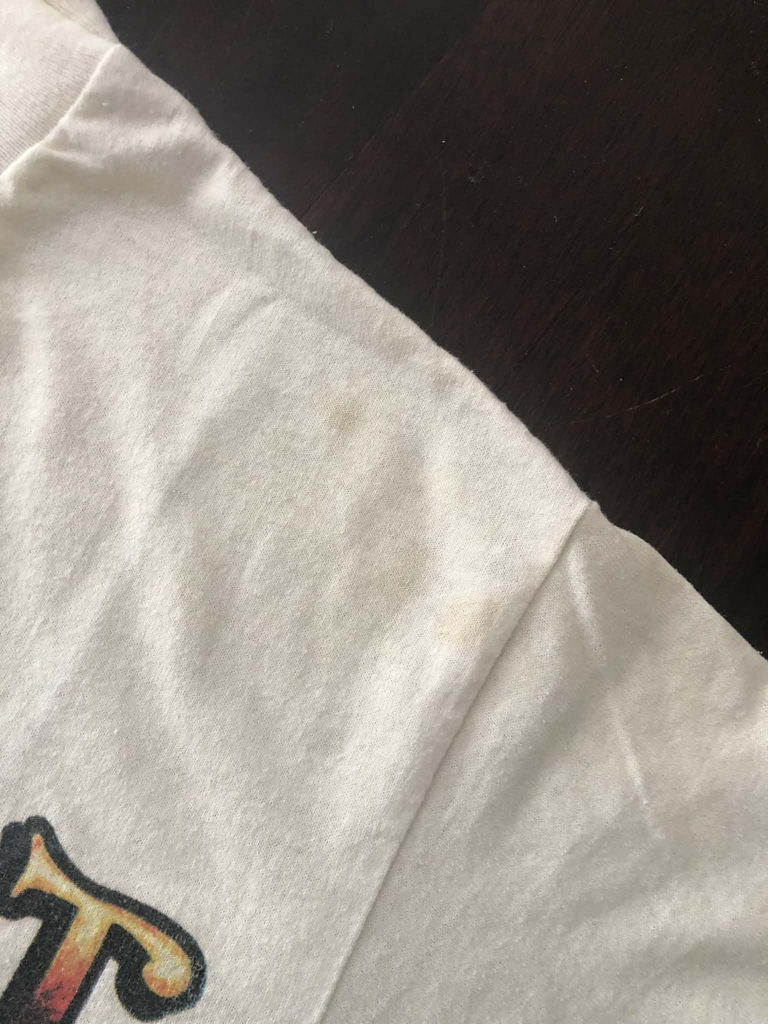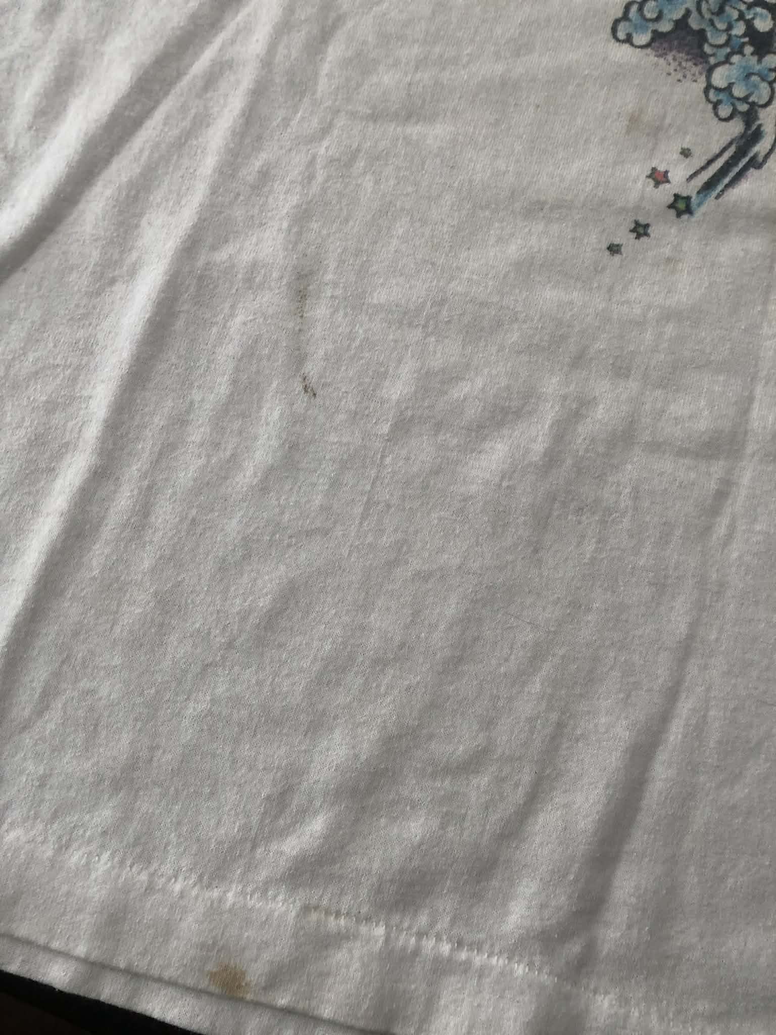 Soft graphics and cotton, slight yellowing around neck. Some staining and spots as pictured. No tag but sizes between a small and medium , check measurements. Graphics by Spider Webb
